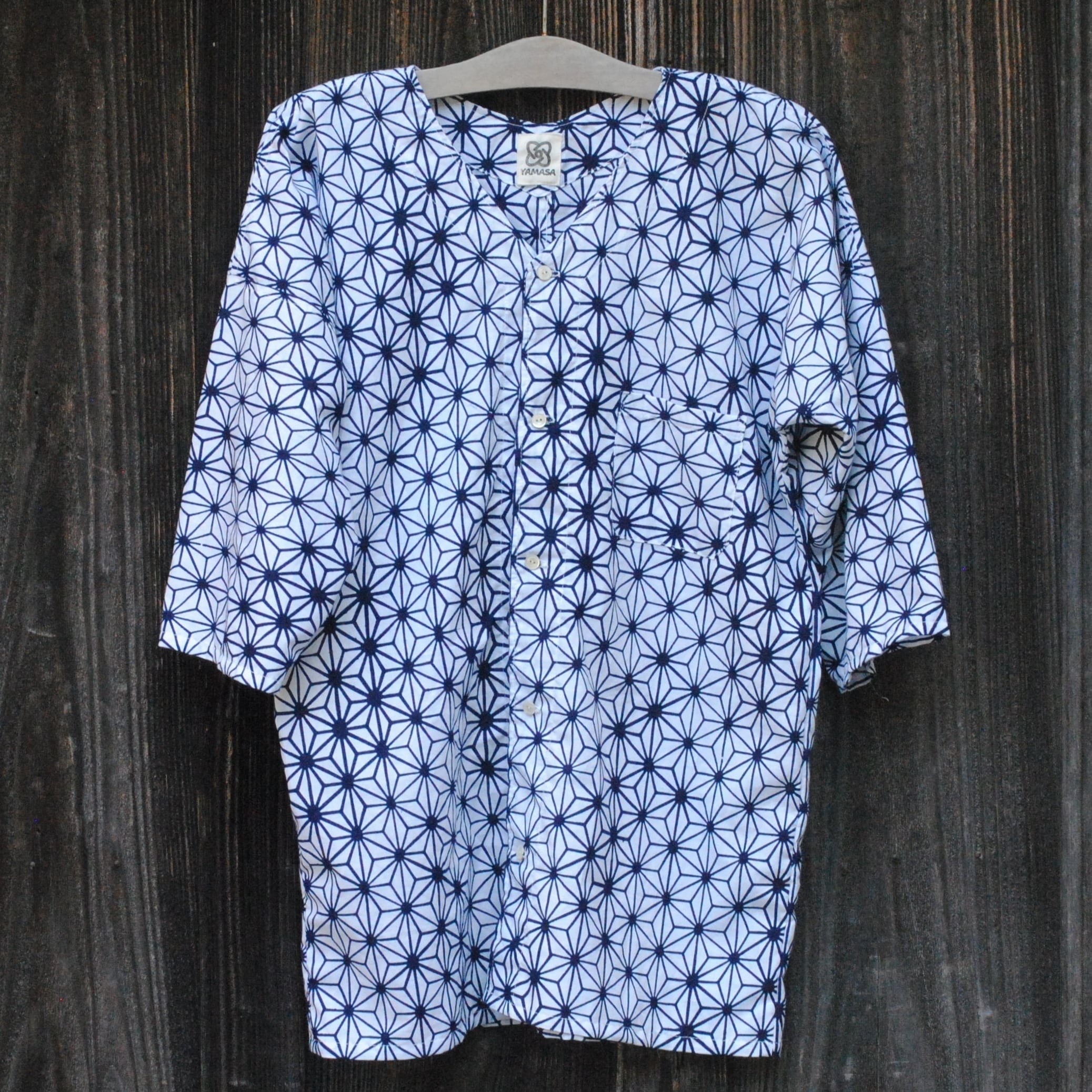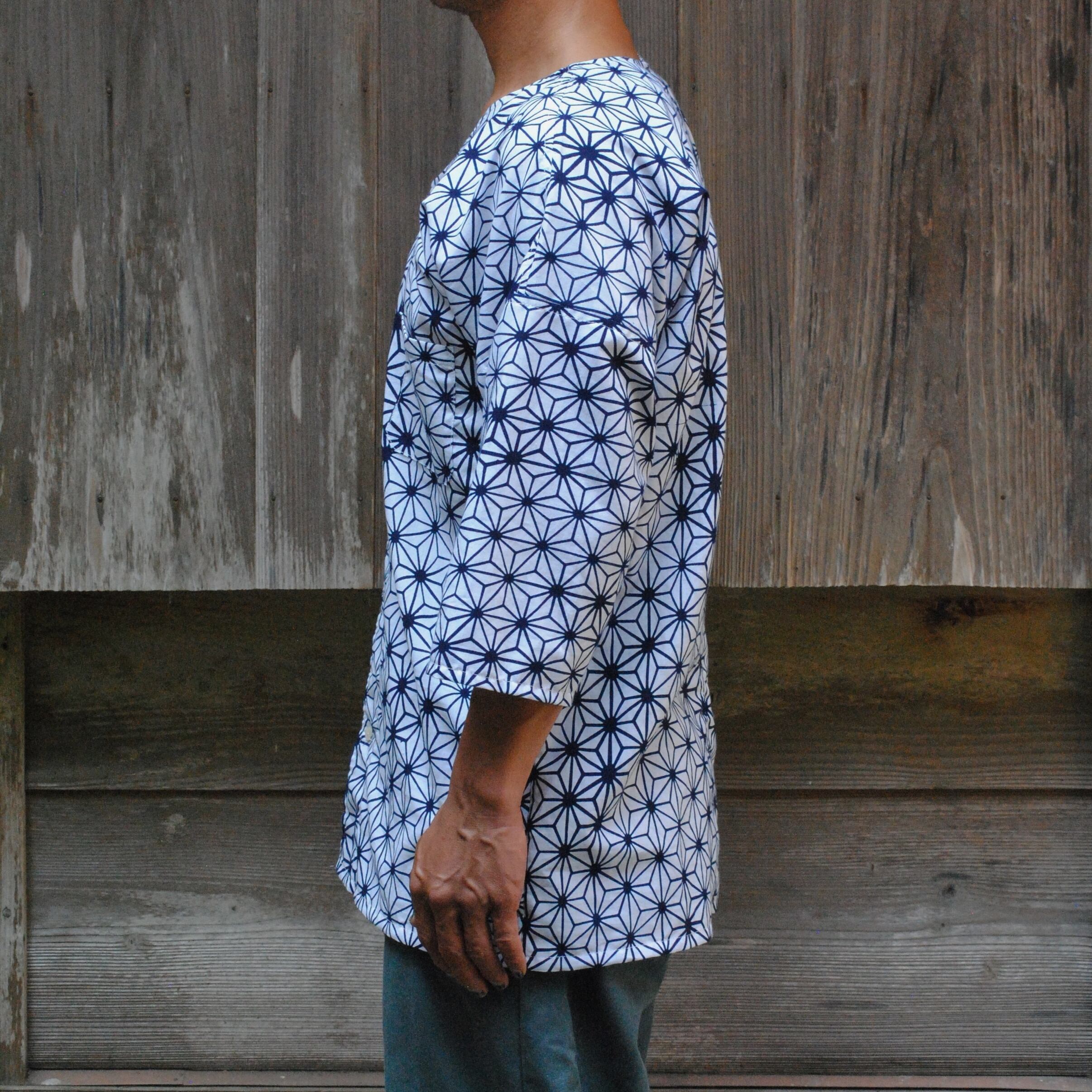 日本の祭りや庭仕事など古くから着られている鯉口シャツを、ゆるっと着用するダボシャツ寄りのデザインにして制作しました。