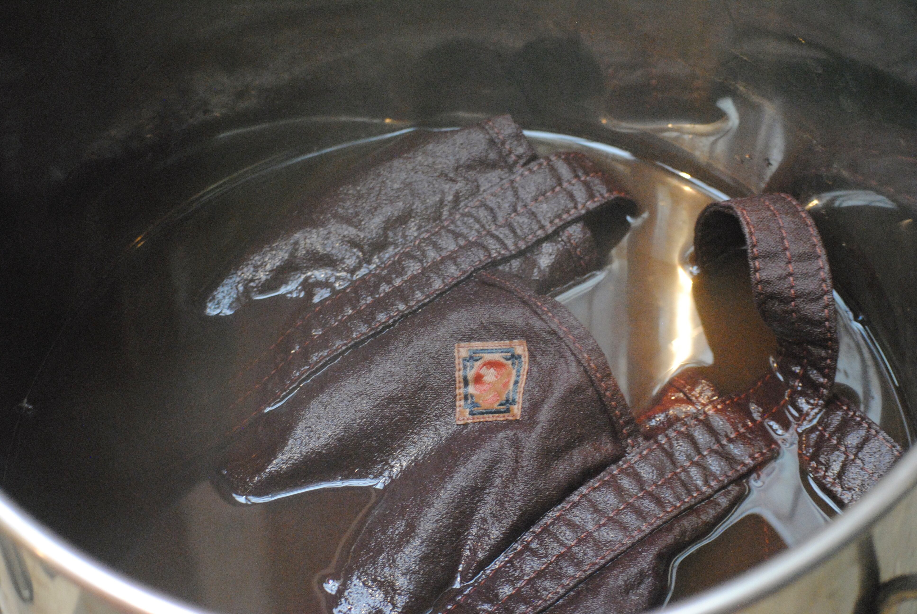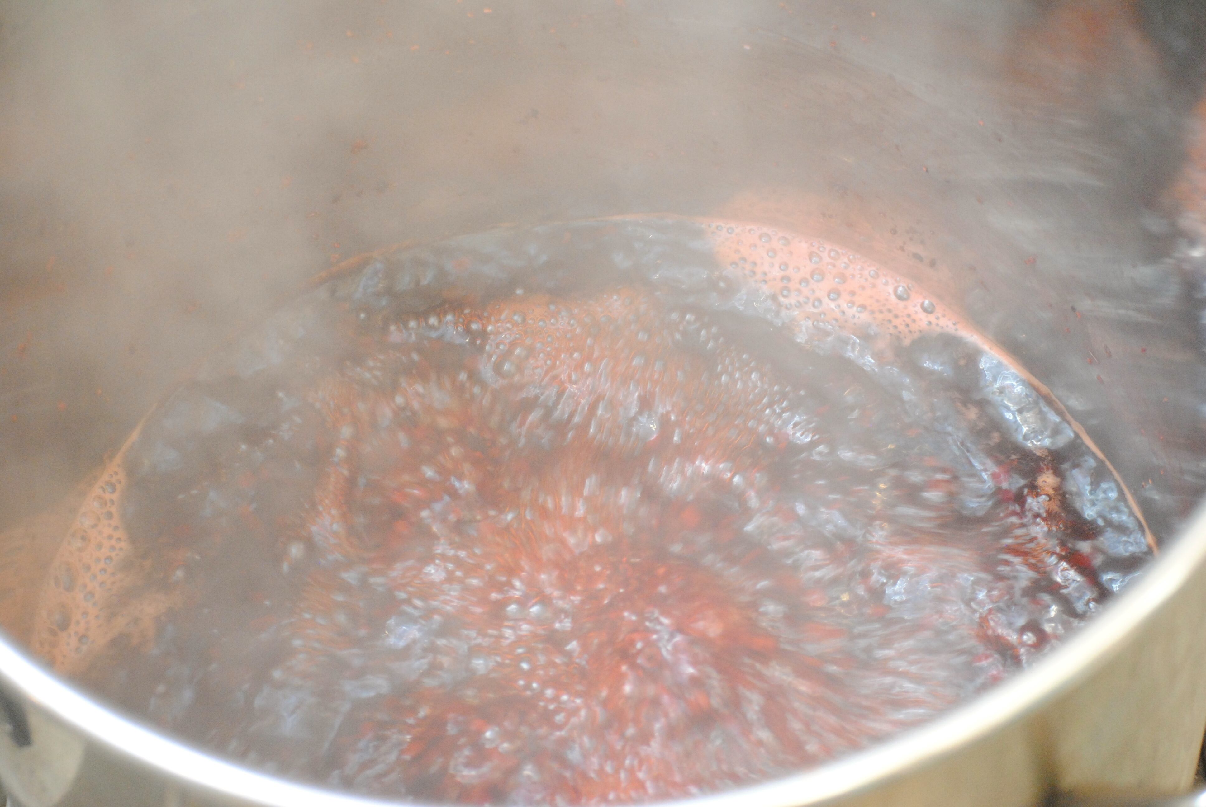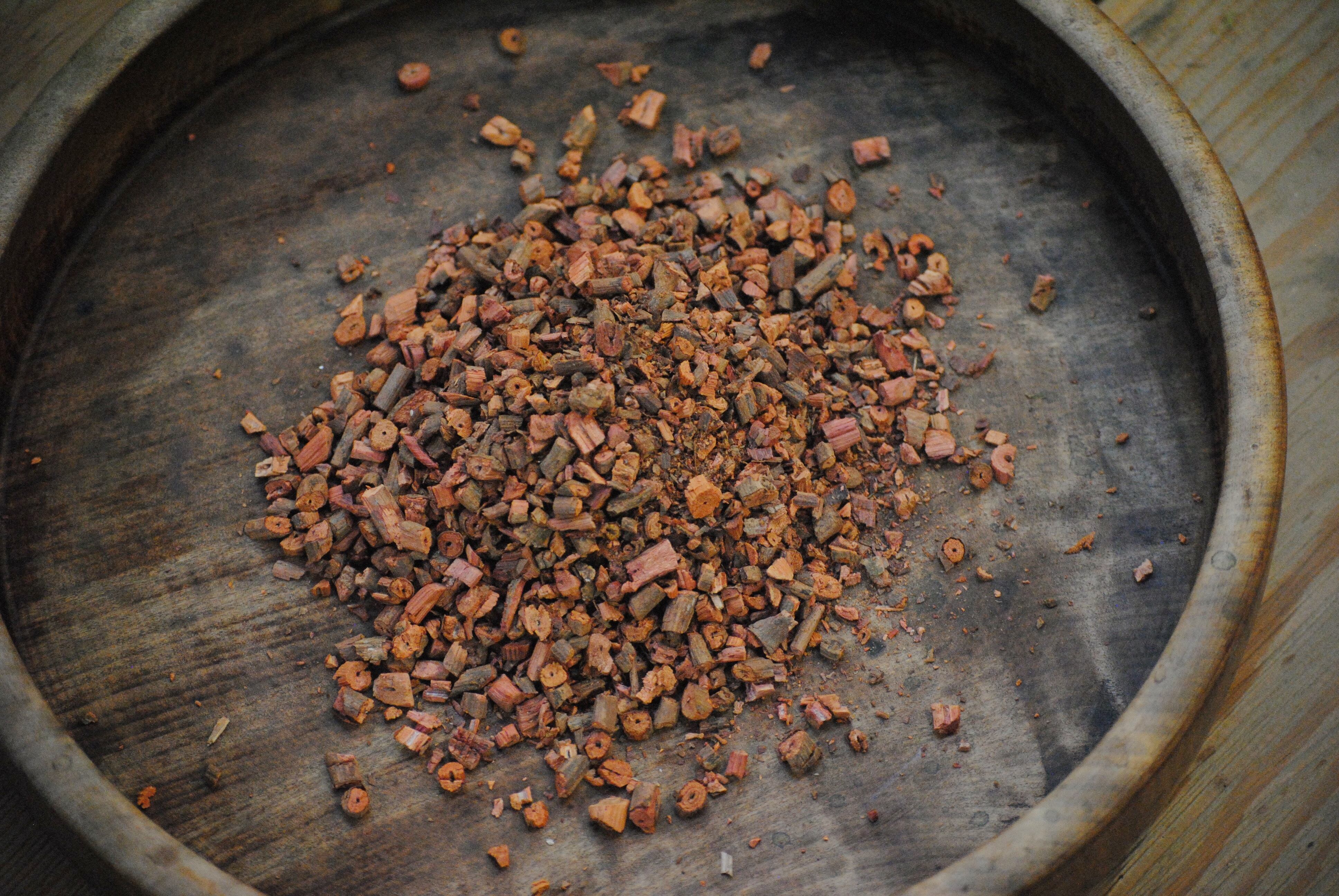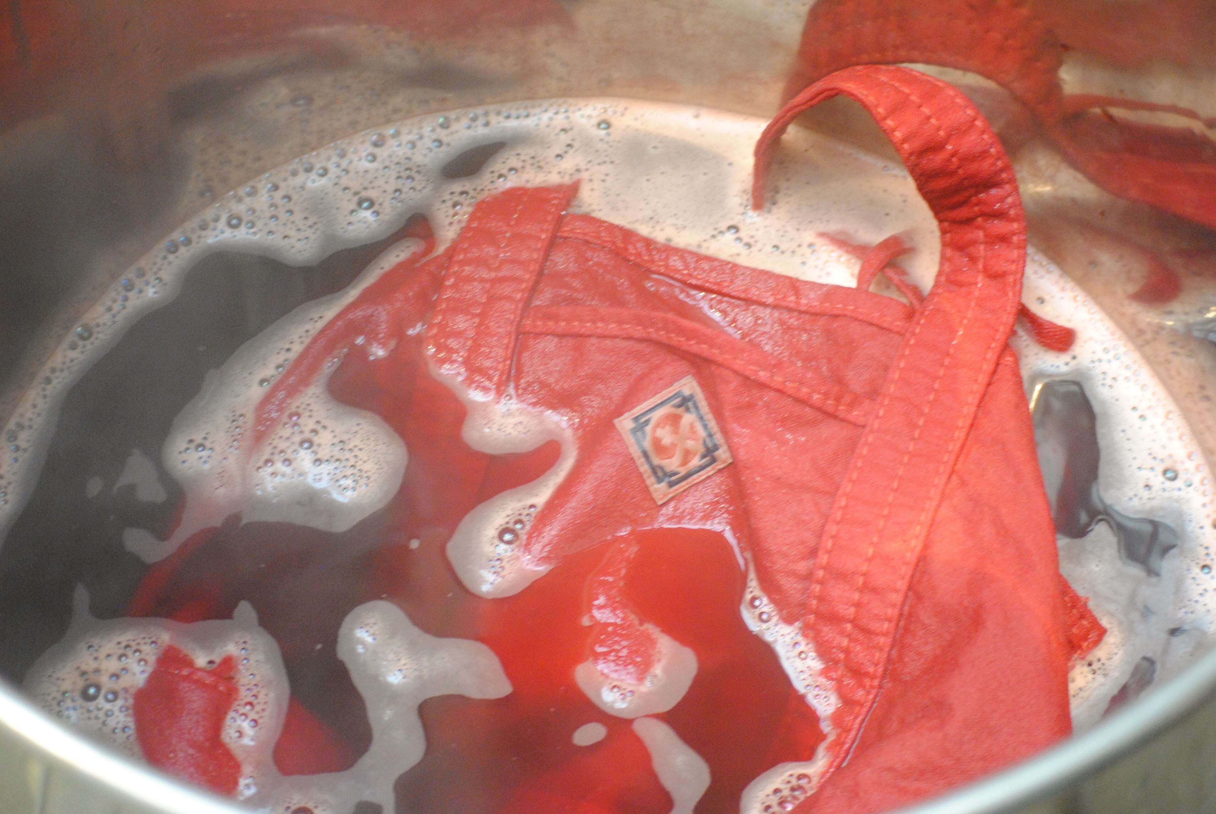 染色は、染料に植物の「茜」の根を乾燥させたものを使用しており、何度も煮出して染液を作ります。ゆっくりと時間をかけて染色した後に、鉄媒染をし、再度染色しています。