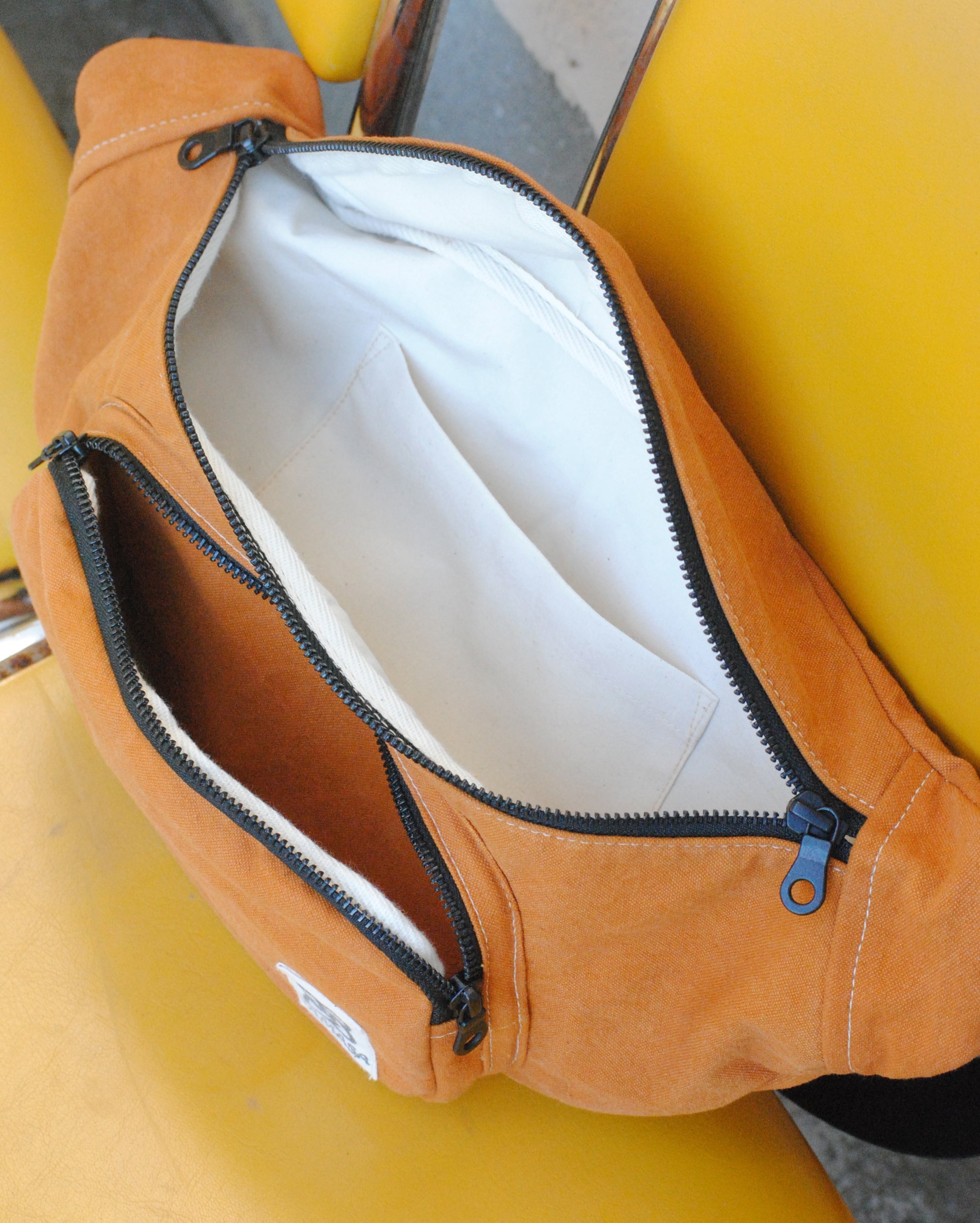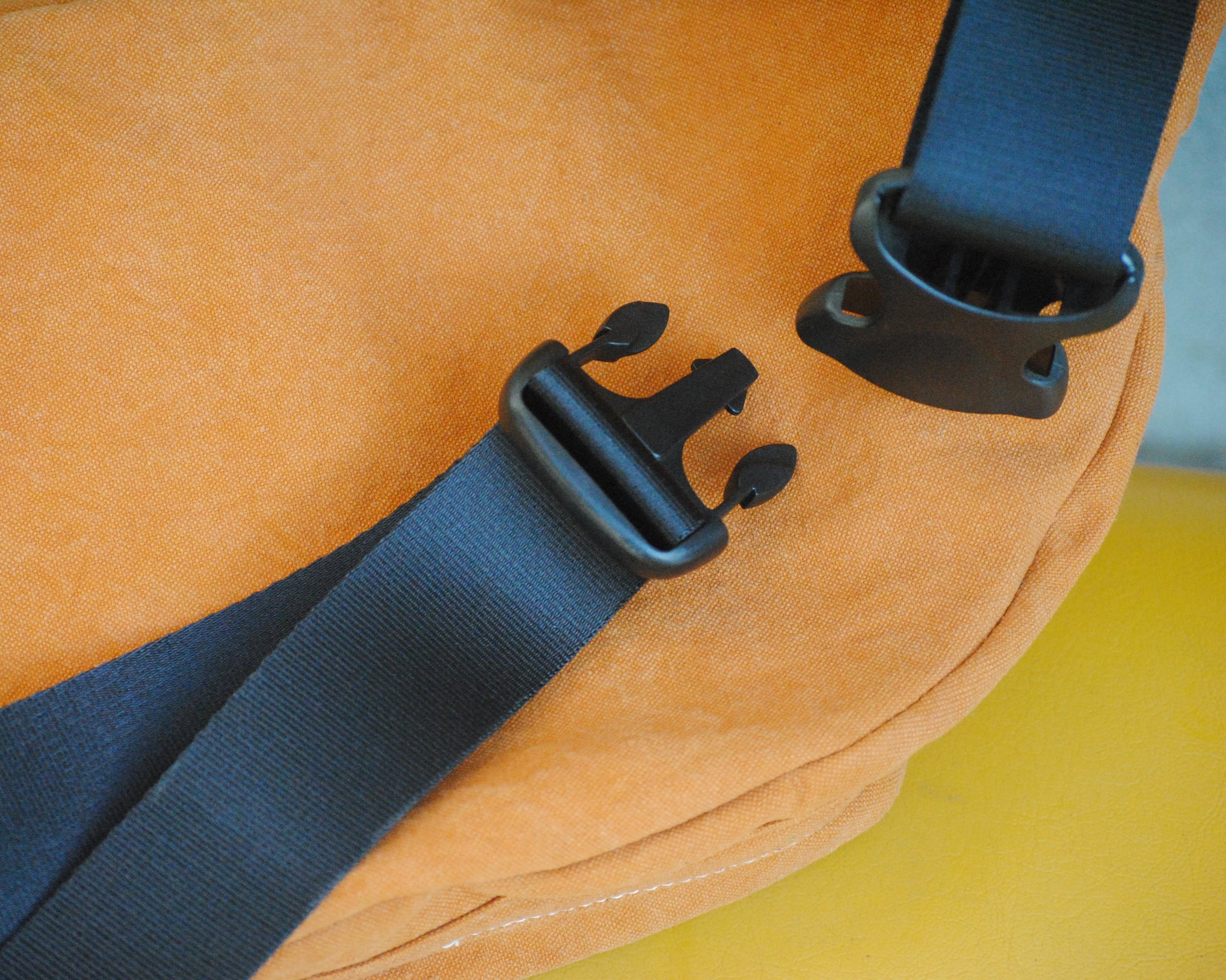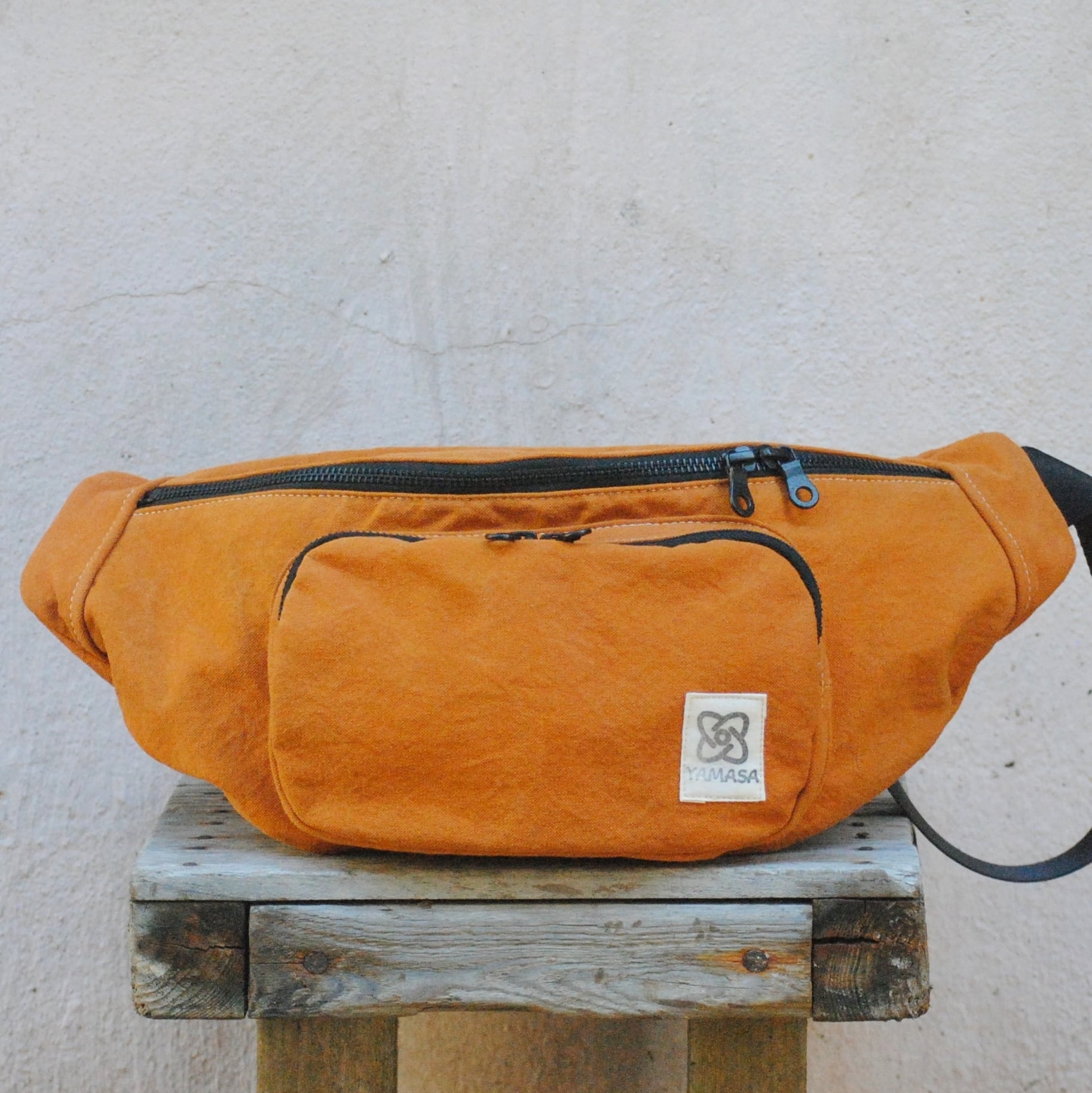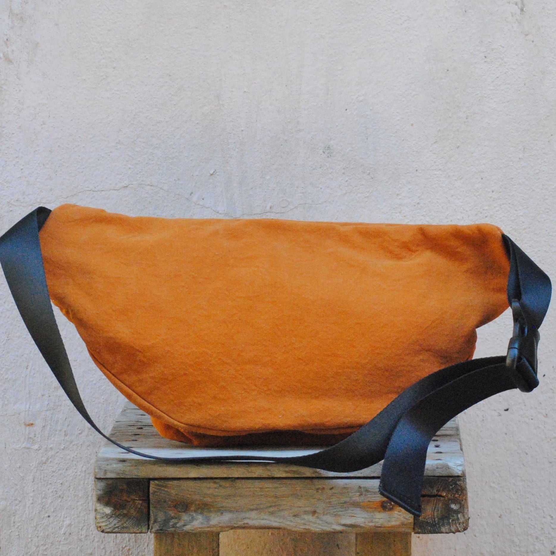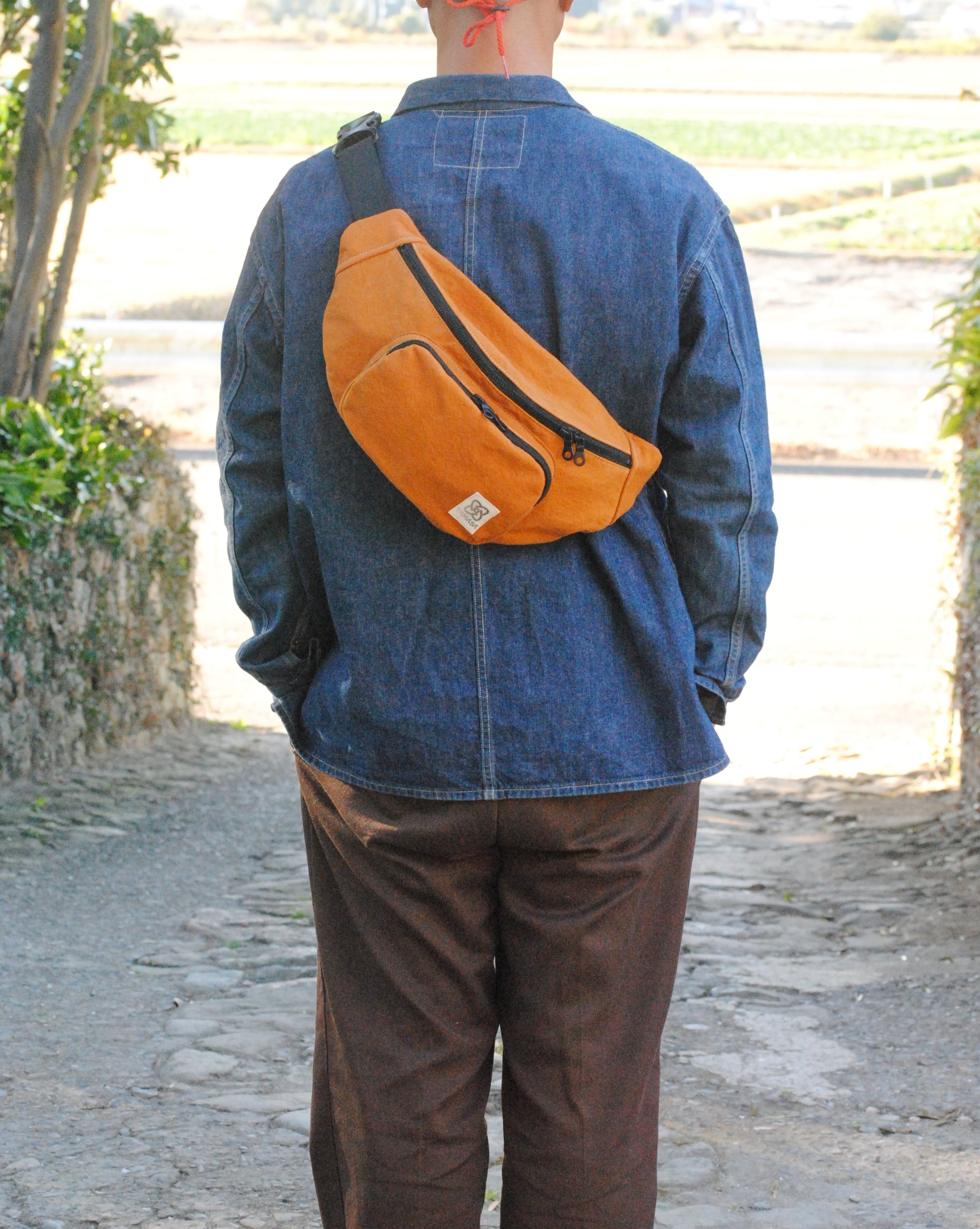 ボディにはふんわり軽くて丈夫な11号帆布を使用しています。染色は、普段なら廃棄されてしまう玉ねぎの皮を何度も煮出して染料を作り、時間をかけてじっくりと染色し、アルミ媒染後、再度染色しています。発色良く鮮やかで深みのある色合いは、普段のお洋服のコーディネートの挿し色としても使えそうです。また、経年変化もお楽しみいただけ、使うほどに味わい深くなっていきます。ベルトの長さは調節可能で、短めでも長めでも、おしゃれな雰囲気です。