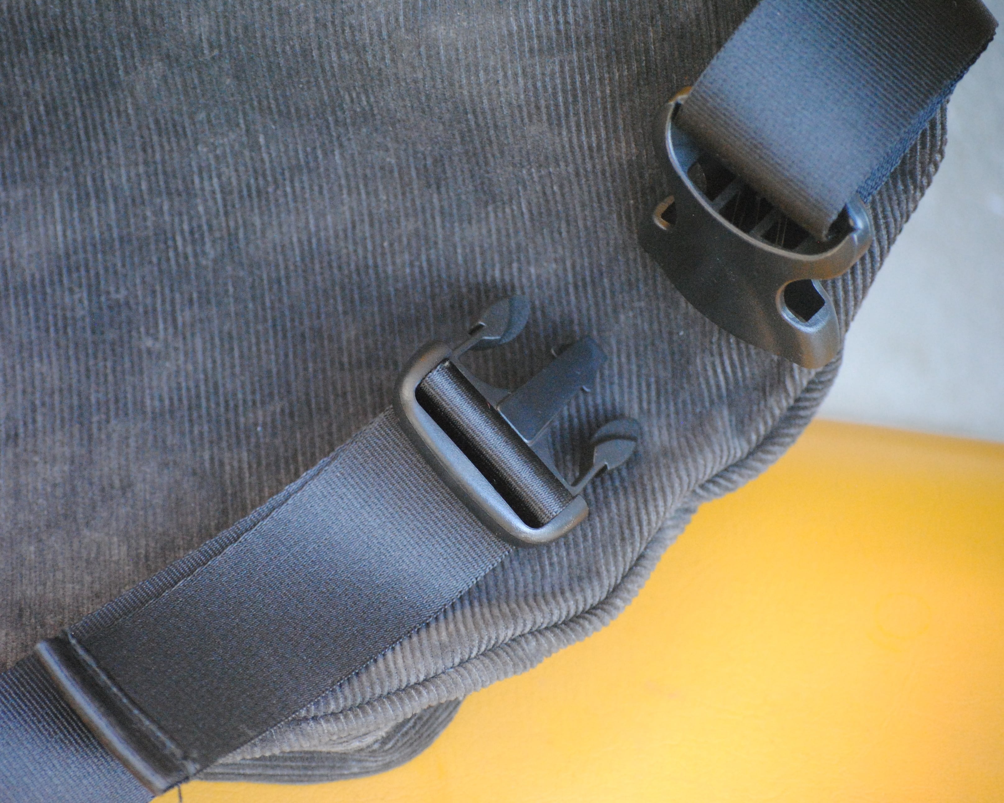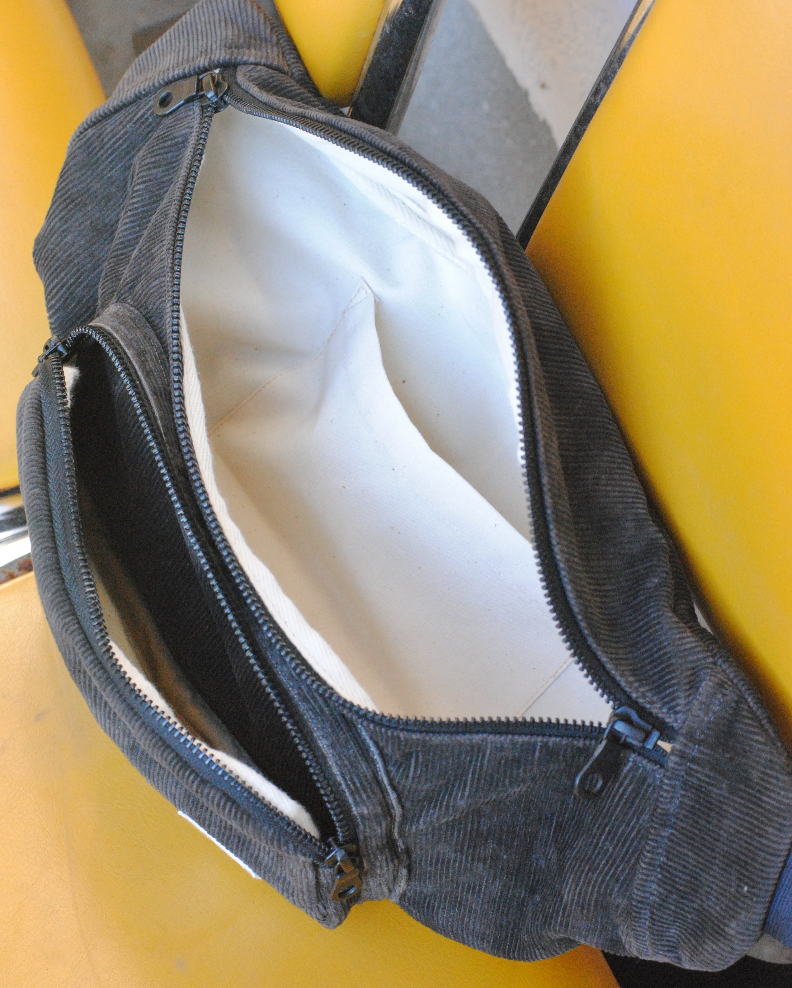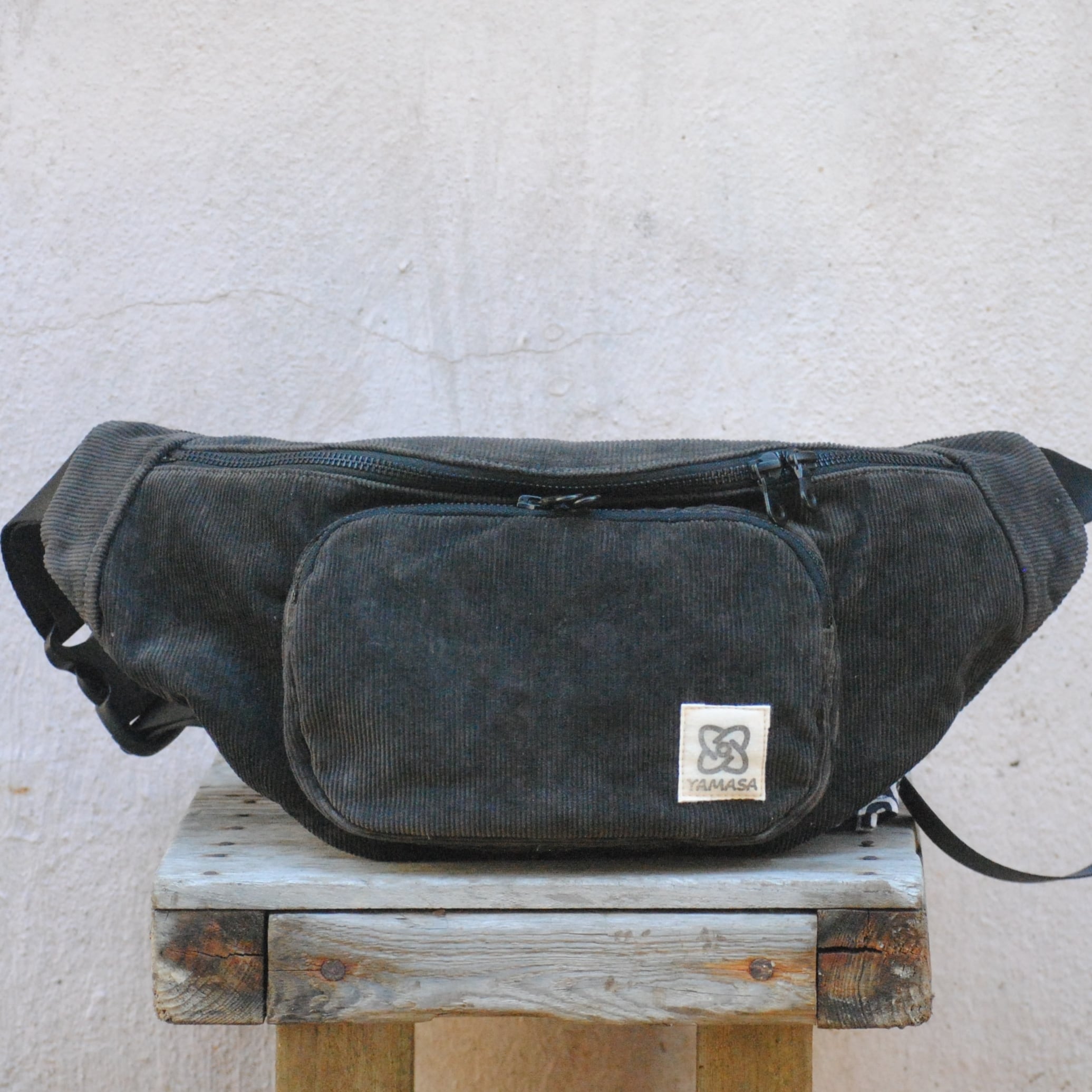 ボディには薄手のコーデュロイ生地を使用しています。染色は、沿岸部に自生するヤシャブシの実を乾燥させたものを何度も煮出して染料を作り、時間をかけてじっくりと染色し、鉄媒染後、再度染色しています。植物由来の何とも言えない優しく深みのある色合いは、経年変化もお楽しみいただけ、使うほどに味わい深くなっていきます。ベルトの長さは調節可能で、短めでも長めでも、おしゃれな雰囲気です。