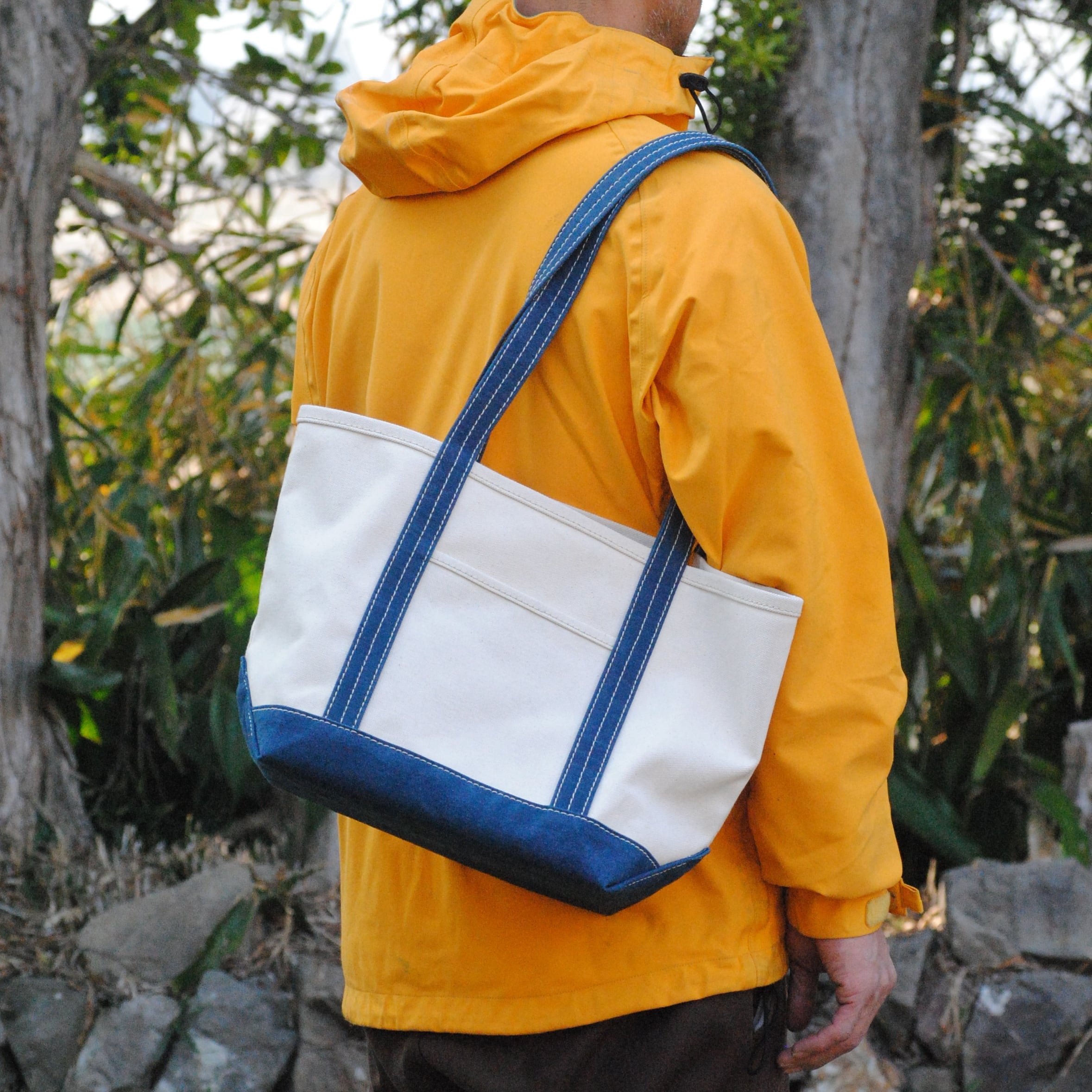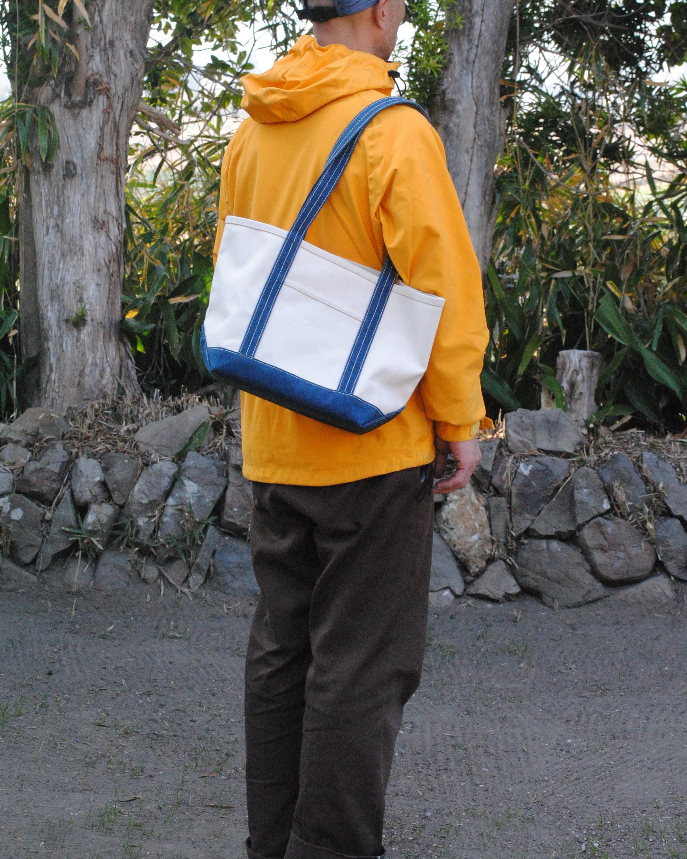 ボディは丈夫な6号帆布を使用し、持ち手と底の染色は藍染めを何度も染め重ねており、存在感のある鞄です。