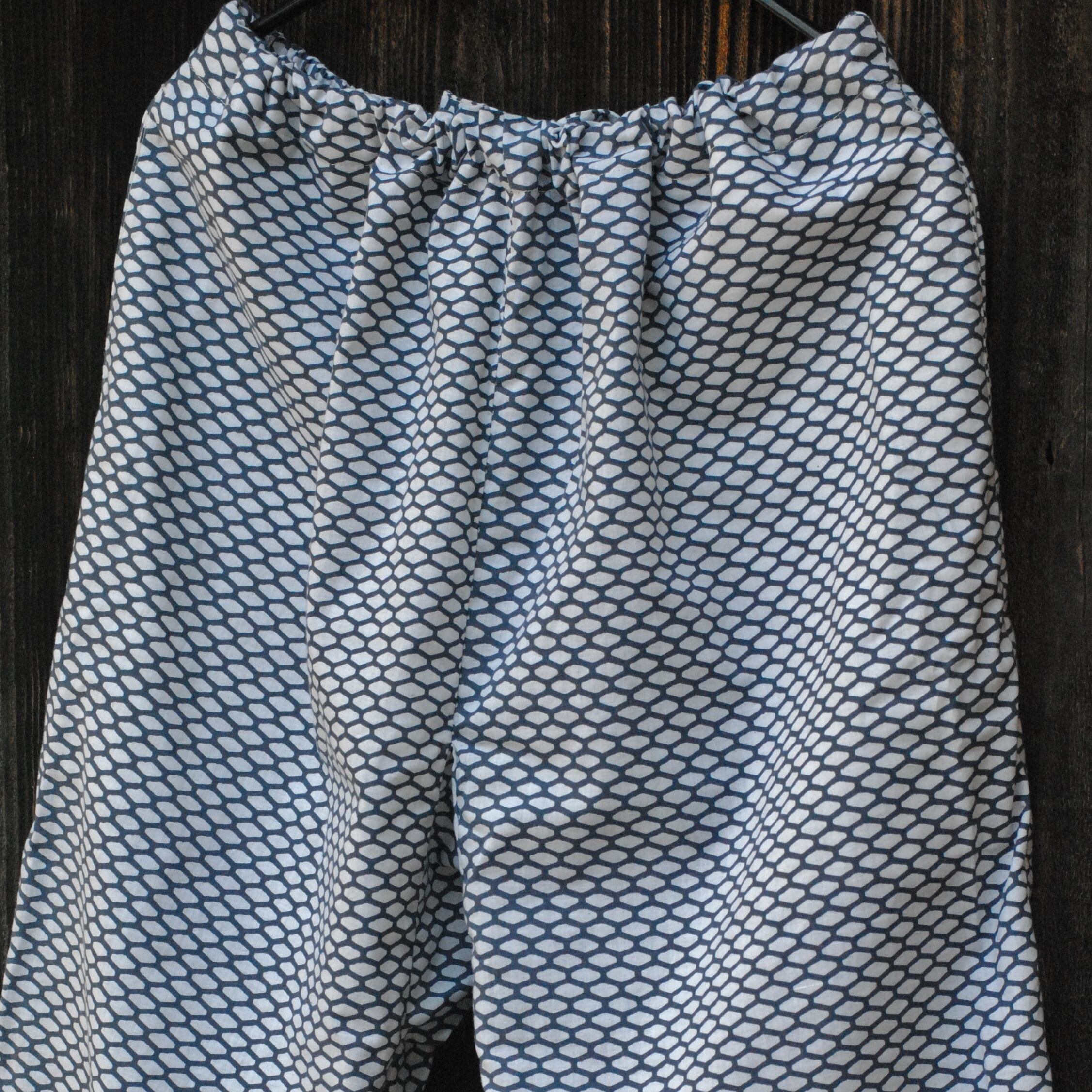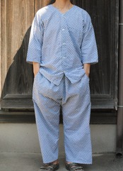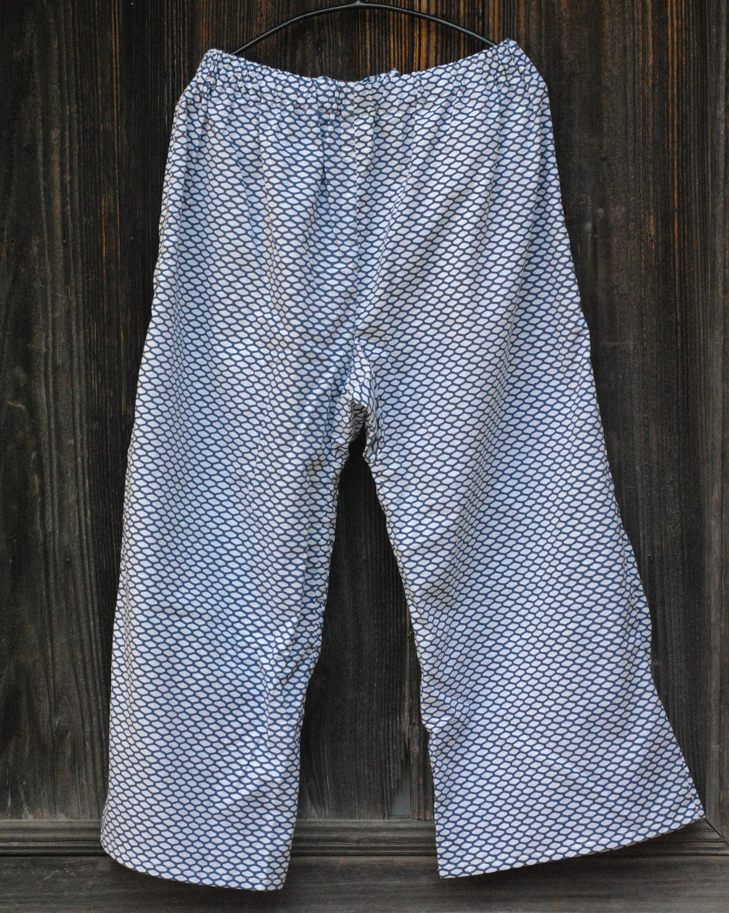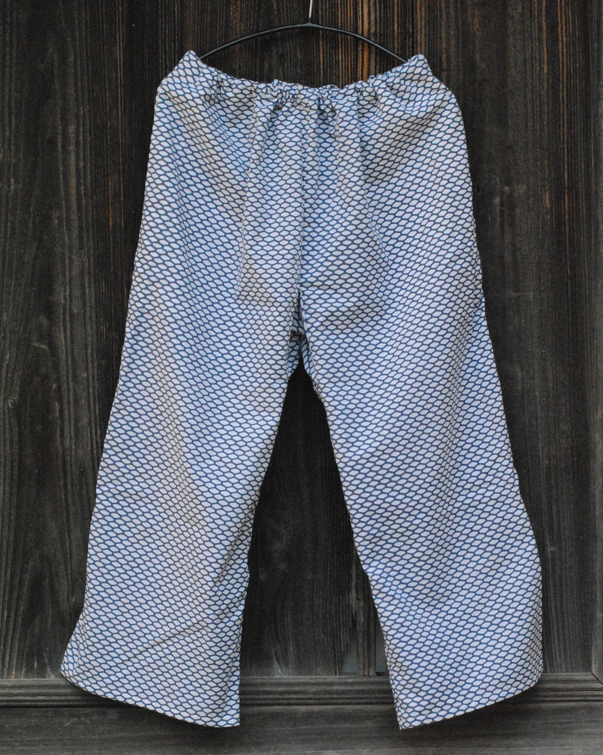 パンツは、日本の古くから用途を変化しながら穿かれていた袴を改良し、ゆとりあるデザインにしており、動きやすく、そして、穿き心地も良いです。ウエスト部分は背面はゴム入り、前面は体型に合わせて紐で縛って調節できるようになっています。また、両サイドにポケットもあり便利です。